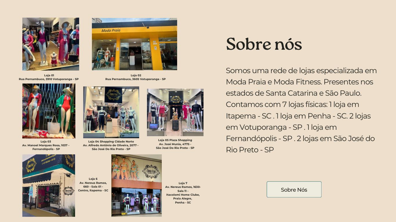 Somos uma rede de lojas especializada em Moda Praia e Moda Fitness. Presentes nos estados de Santa Catarina e São Paulo. Contamos com 5 lojas físicas: 1 loja em Itapema - SC . 1 loja em Penha - SC. 1 loja em Ilhota - SC. 2 lojas em Votuporanga - SP